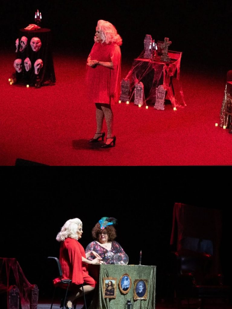 En este juego entra también Paca La Piraña, que aparece reinterpretando personajes icónicos del terror desde su propio estilo. Sus intervenciones aportan un contrapunto al monólogo de Xenon y convierten la función en un diálogo constante entre la parodia y el homenaje.