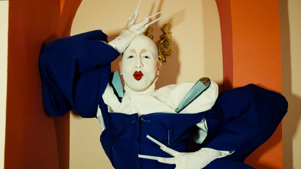 Otros fragmentos de la letra refuerzan esa construcción identitaria mutable y extravagante: “Soy un pantone cada día / cambio color fantasía / like Pat McGrath”. Aquí el maquillaje no es adorno, es lenguaje artístico; la referencia al imaginario editorial conecta directamente con la dimensión de moda que atraviesa todo el proyecto. El cierre con “#menudahumildad” introduce la ironía camp. El ego no es literal, es performativo, es humor drag llevado al exceso como gesto político y estético.